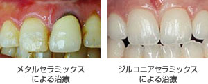 メタル セラミックスの治療を施した左の写真では、修復物から金属イオンが溶け出しマージン部が黒く変色していますが、金属を一切使用しないジルコニア セラミックスを使用した右の写真では、マージン部分の歯肉も健全な状態のまま審美性が保たれています。